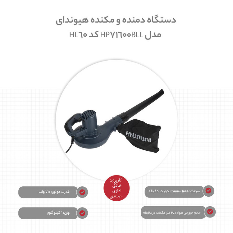 محصولی که مشاهده میکنید دستگاه دمنده و مکنده (HP71600BLL) تولید شده توسط شرکت «هیوندای» (Hyundai) است. این دستگاه دارای دو حالت دمنده و مکنده است. از حالت دمنده برای کارهایی مثل غبارروبی سطوح و منافذی که امکان تمیزکردن با دست وجود ندارد مثل داشبورد خودرو و بوردهای الکترونیکی میتوان استفاده کرد. در حالت مکنده هم باتوجه به کیسهای که در بستهبندی محصول وجود دارد، برای جمع کردن خاک و غبار استفاده میشود. این دستگاه از وزن و ابعاد مناسبی برخوردار است. از آنجاییکه برای استفاده از این دستگاه، باید آن را دردست گرفت، پس باید وزن و اندازهی مناسبی داسته باشد که نهایت راحتی را برای کابر فراهم کند. از دیگر نکات قابل توجه این دستگاه میتوان به قدرت موتور آن اشاره کرد. شرکت سازنده از موتوری با قدرت 710 وات برای این مدل استفاده کرده است. سرعت موتور این دستگاه از 6000 تا 13000 قابل تنظیم است و حجم هوای خروجی از آن 3.5 متر مکعب دردقیقه است. منبع انرژی این دمنده مکنده، برق است و از یک کابل بهطول 2 متر بهره میبرد. به همراه این محصول سه عدد سری نازل و یک لوله برای اضافه شدن طول ارائه میشود.